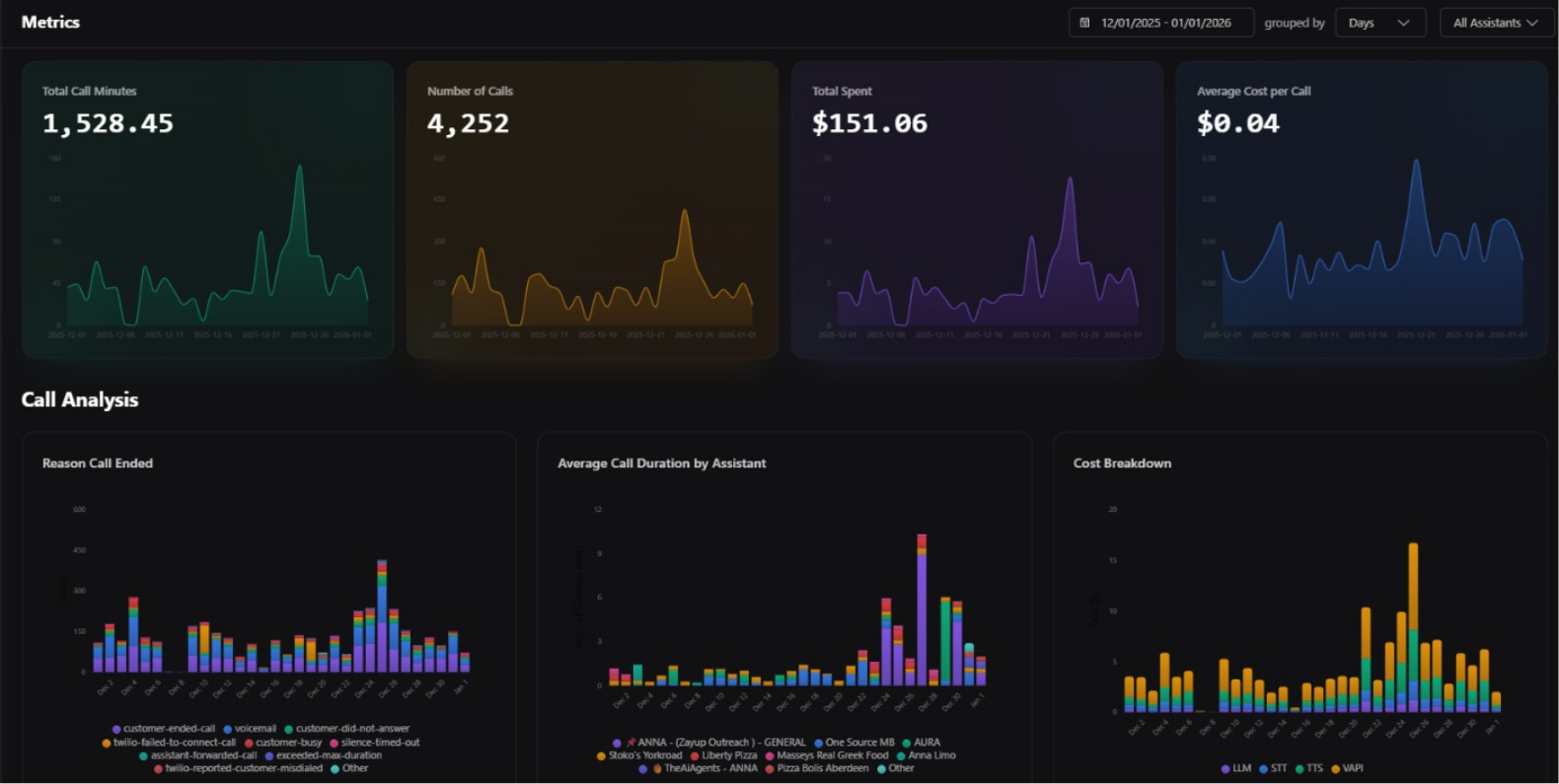 Every call is logged, transcribed, and analyzed in your dashboard. You’ll see outcomes, duration, and conversion trends — so you know what’s working and what’s not.